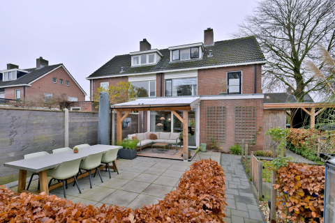 Grote raampartijen in voor-, achter- en zijgevel zorgen voor een mooi lichtinval in de living. Beide dakterrassen zijn via een drietal dubbele deuren rechtstreeks bereikbaar.